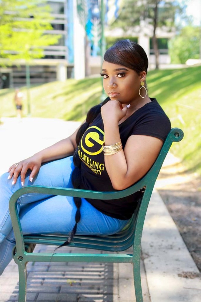 Gabrielle started off with her Gramblings State University shirt and her blue jeans, with some black hills. We got a couple of shots by our starting point which was actually by an elevator and some steps. I had her stand on the steps and then sit down with her cap in hand. We then moved on over a little near the water and there was a green bench they had over there that I just had her sit on and prop her arm up. At that point the sun was starting to beam down, but it had turned out to be such a nice day that we took full advantage of for the session and video footage.