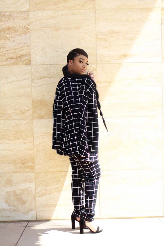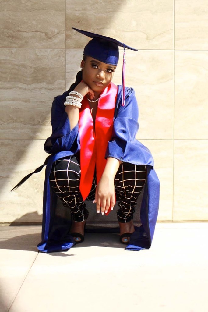 We then went down the elevator and I popped up my changing tent for her to change into this black and white suite with a white tank top underneath and I have to say it looked good. The location we were at was perfect. This wall that we ended up at was more than the right background for the outfit. We ended up getting the cap and gown in this outfit.