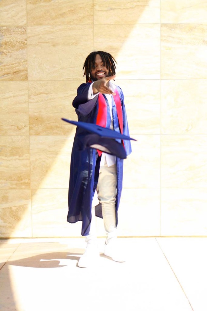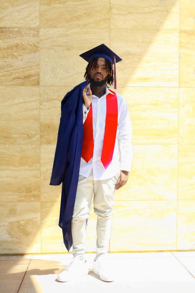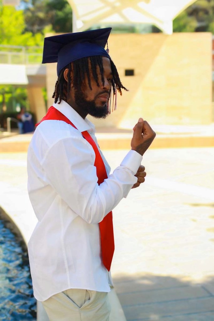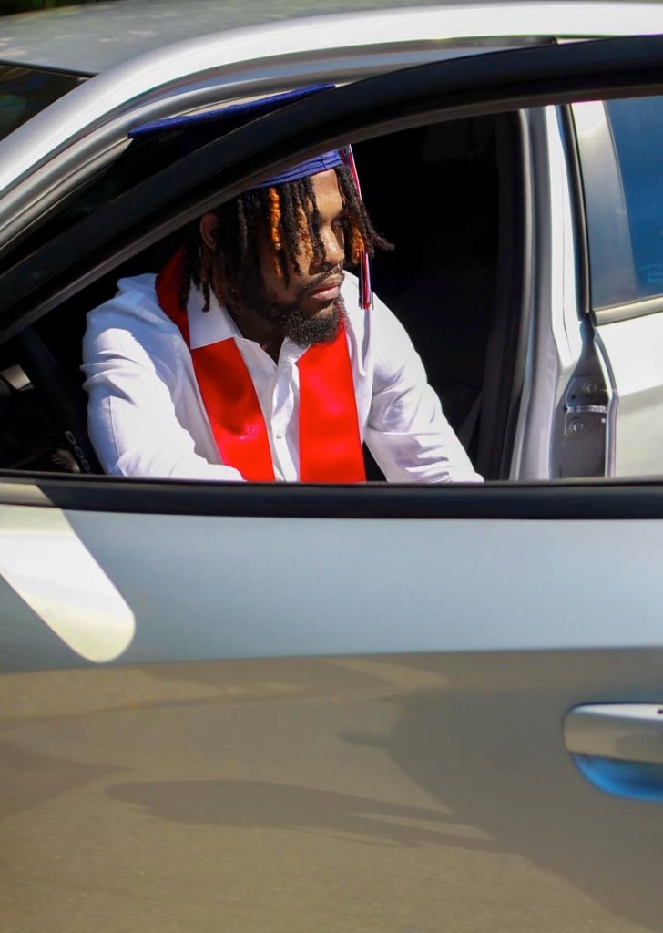 When we moved along the way Myron put on his white dress shirt with some cuff links, and his light khaki dress pants. We sat over by the water, got a few shots and Then we moved over to the same wall that I got with his cousin. I had him add his cap and gown and I got a shot of him throwing his cap up as well as tossing it at me. I loved that shot and how it captured. By then Myron was more than comfortable in front of the frame and it wasn’t much I had to say. On top of the video the capture I got of him with certain poses was actually caught on video and it was captured perfect by Cor-Vizon. At the end of the session in the video For-Vizon got a shot of them driving off with him saying peace and Gabrielle waving her pom pom’s. Perfect, just perfect. saying goodby to the school year of 2021!