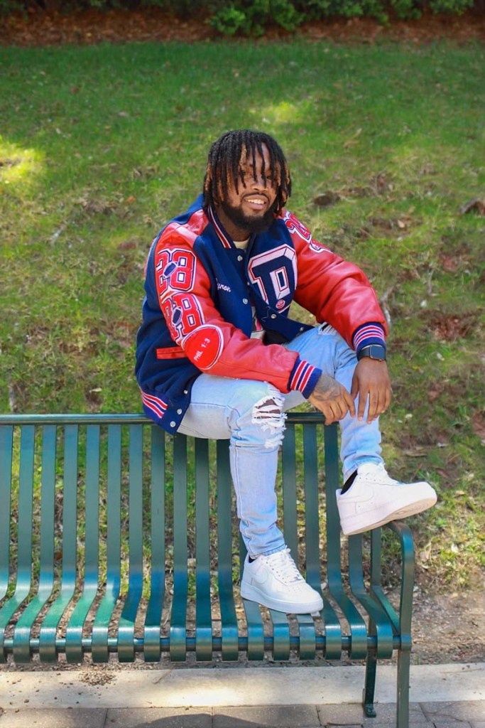 Myron had this sweater made that said 2021 and had pictures of him in them. I loved the cream color that was added to the light washed jeans. He then pulled out the leather-man Jacket and we got some shots with him by the water, we also added the graduation hat with him sitting on the steps.